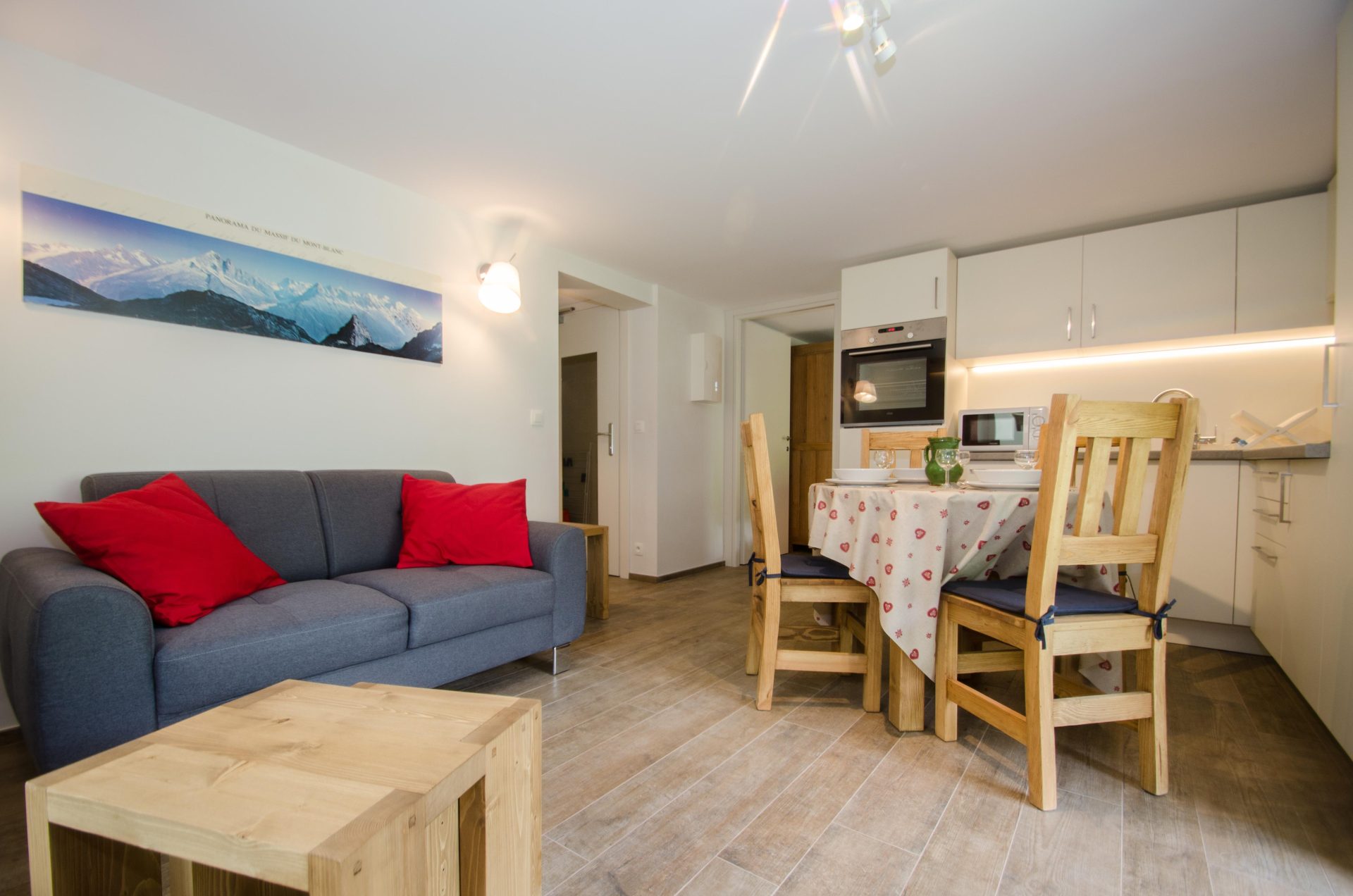 Bel appartement entièrement rénové situé à seulement 150 mètres des remontées mécaniques. Exposé plein sud, il se trouve face à la chaîne du Mont- Blanc et offre une vue exceptionnelle depuis son jardin.