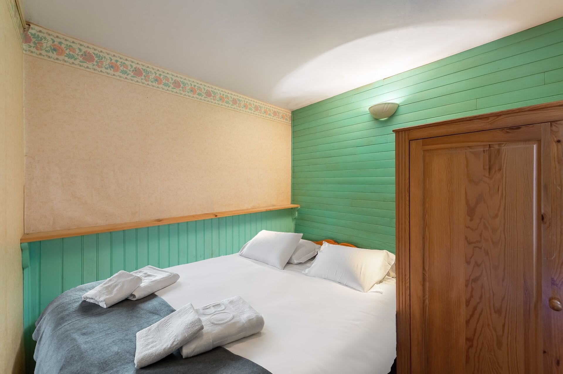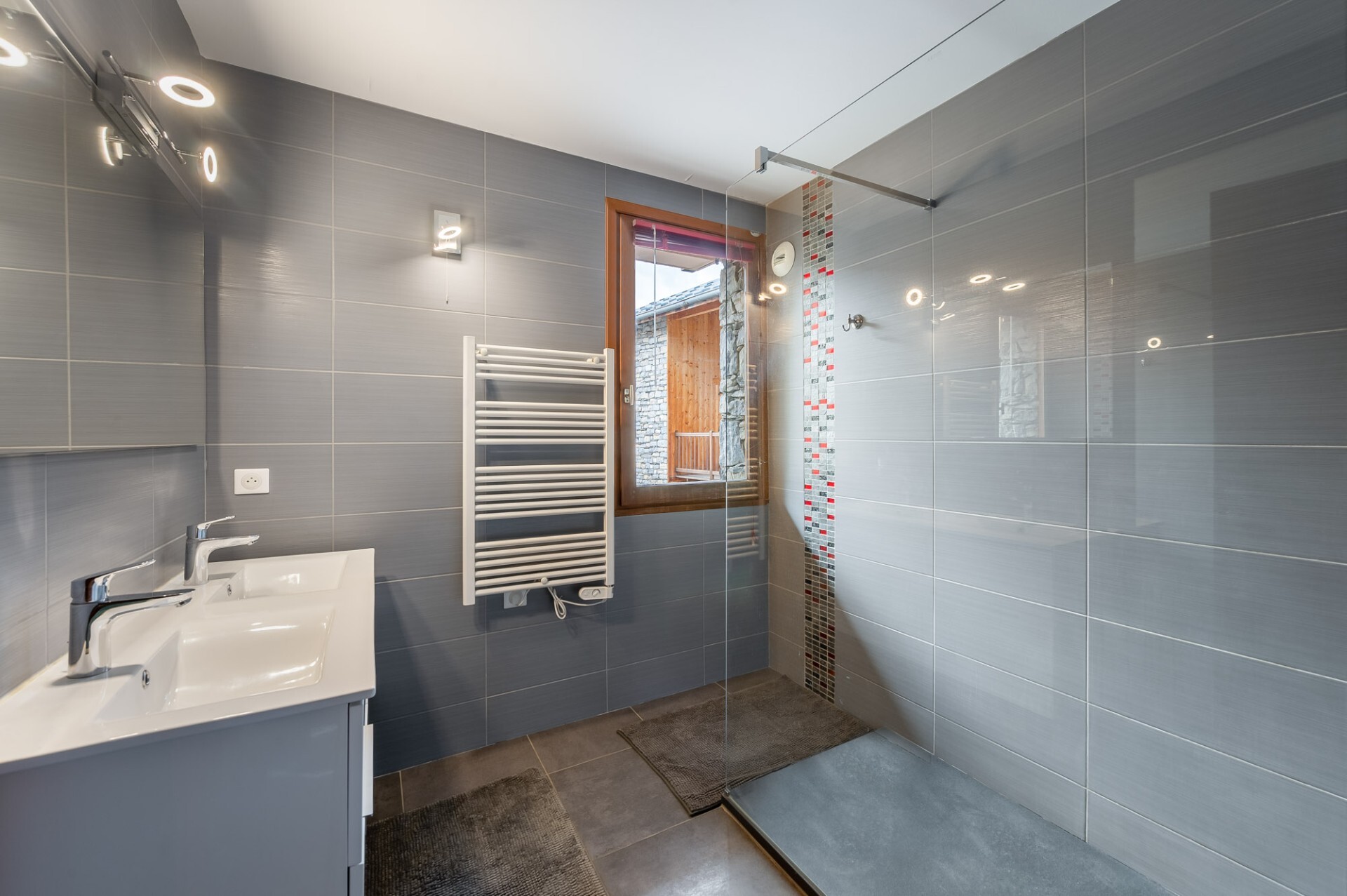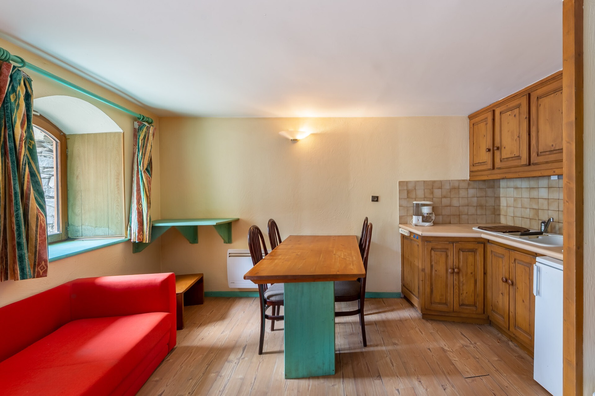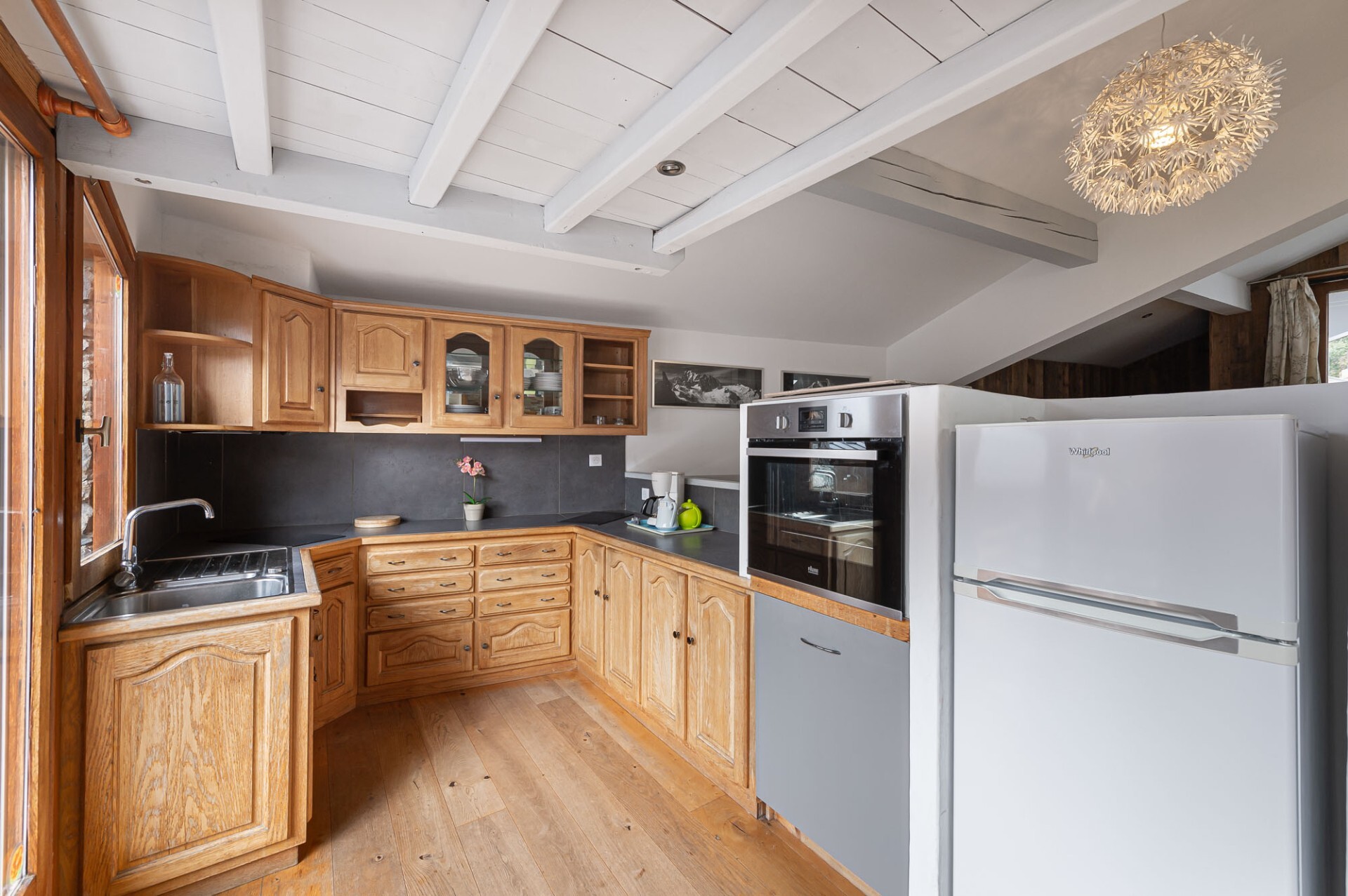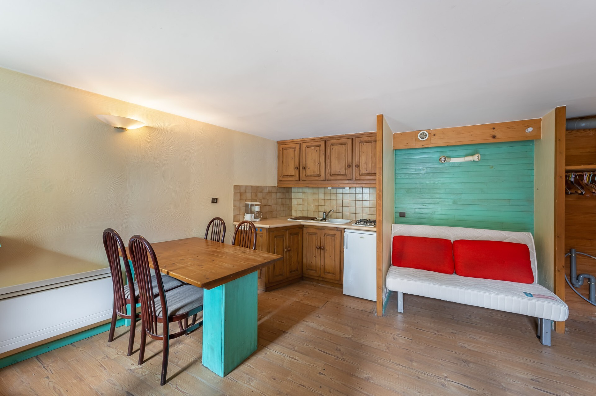 Le chalet est divisé en deux parties indépendantes. L’une, au rez-de-chaussée, est aménagée en studio de 22,73 m² et comprend une cuisine ouverte sur le séjour avec coin montagne et une salle d’eau.