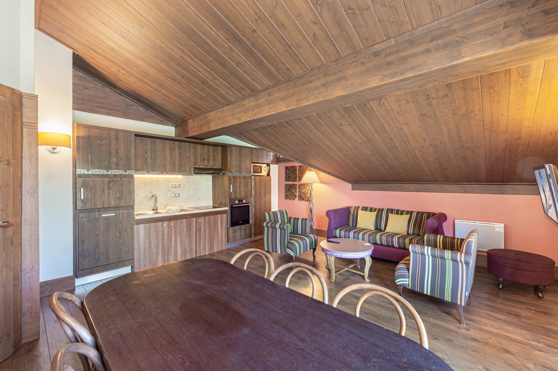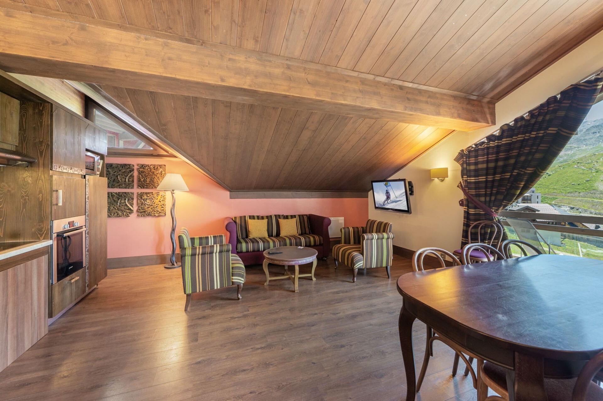 En effet, ce grand appartement de 107m² de surface habitable bénéficie d’un large séjour donnant sur un balcon avec vue sur les sommets.