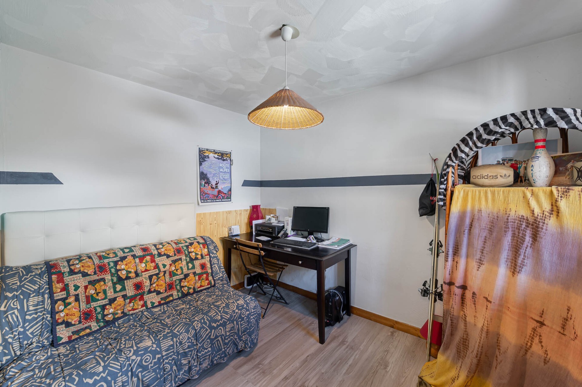 On the second level, the apartment is composed of two double bedrooms, a bathroom with toilets and a sleeping area.