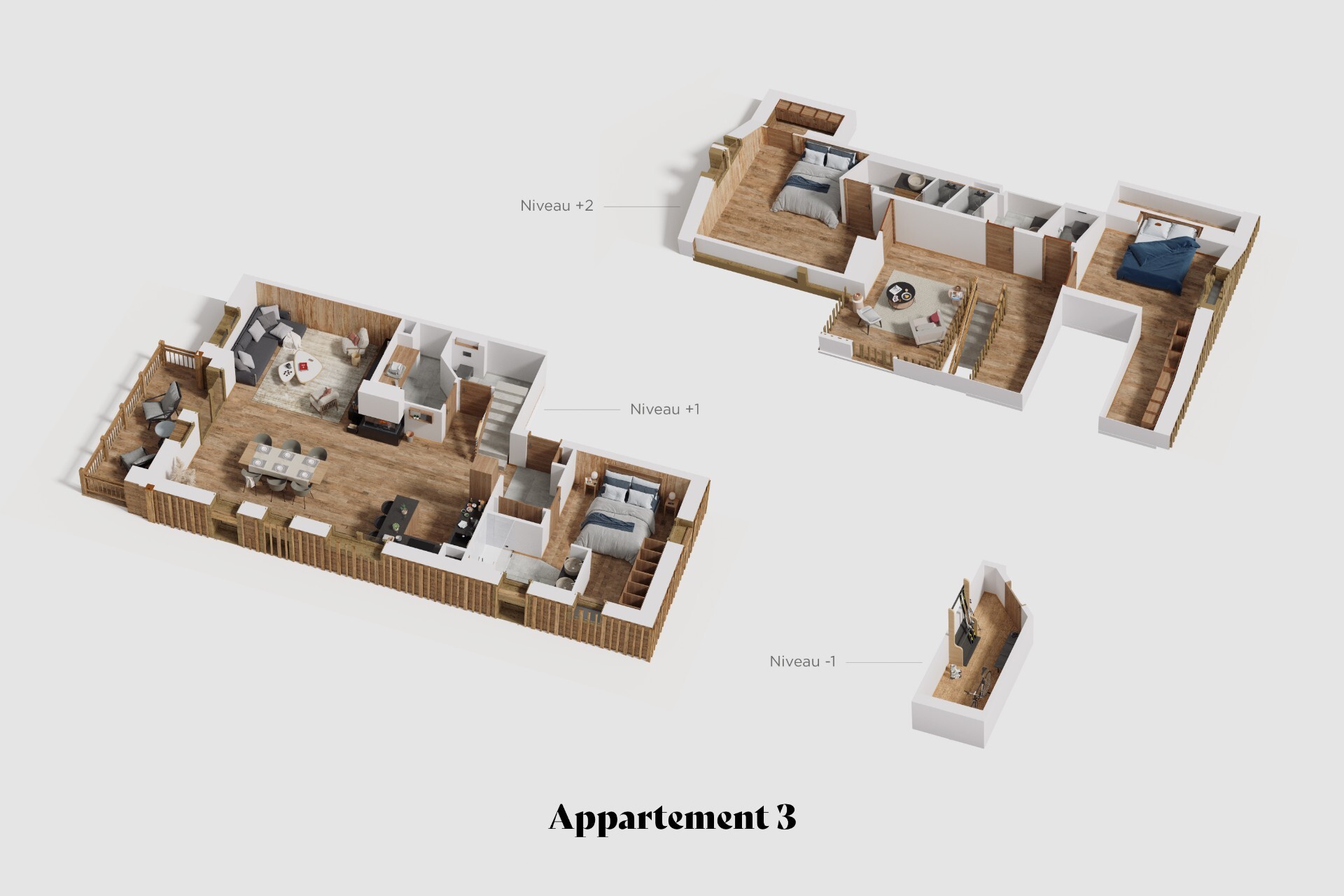 This four rooms appartment on three levels with a surface area of 141.54 sq.m offers on the first level a private ski room, on the intermediate level a large living room with fireplace and open fitted kitchen with access to the terrace of 10.6 sq.m, a double bedroom with bathroom, a storeroom and a separate toilet.