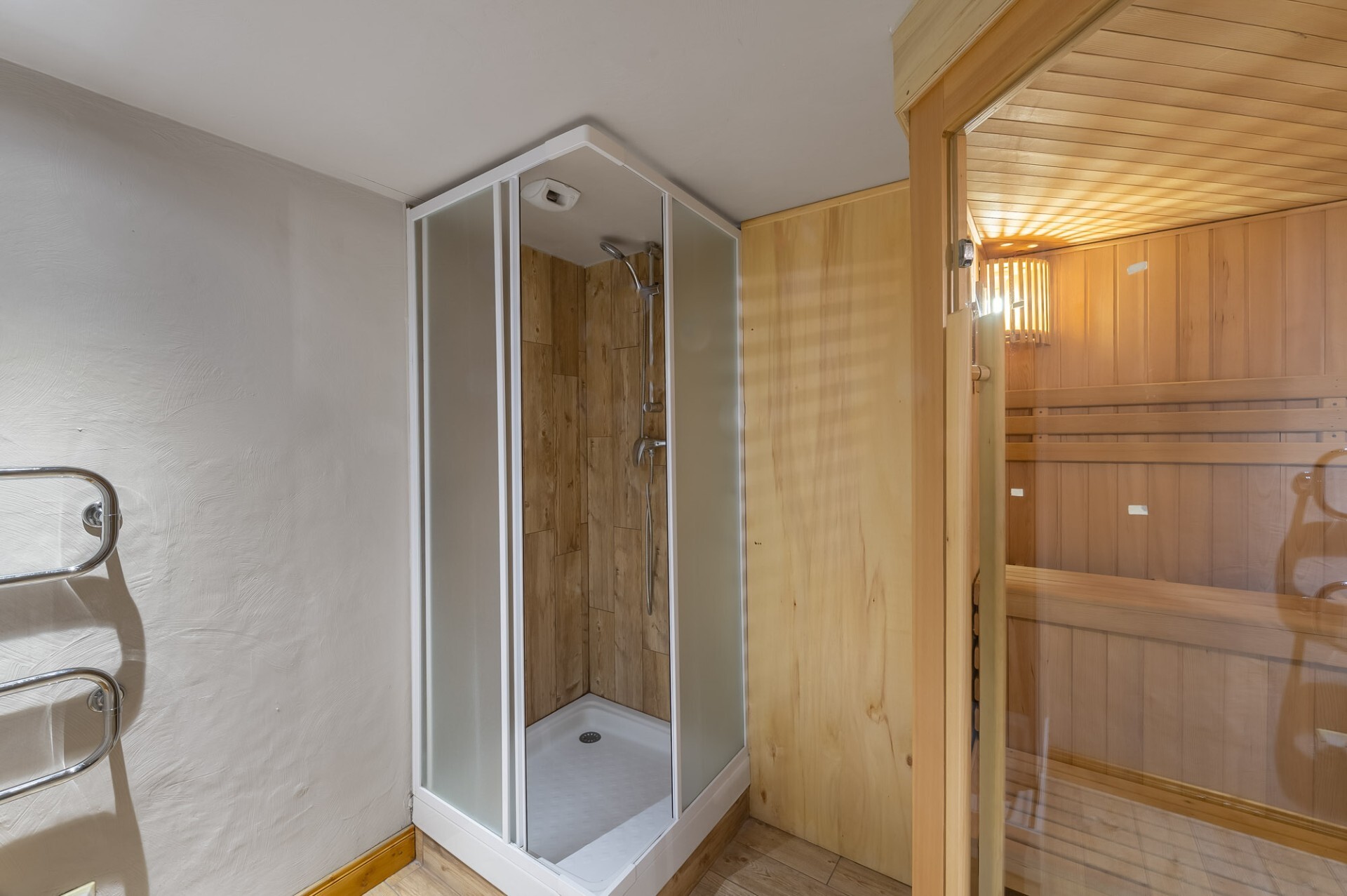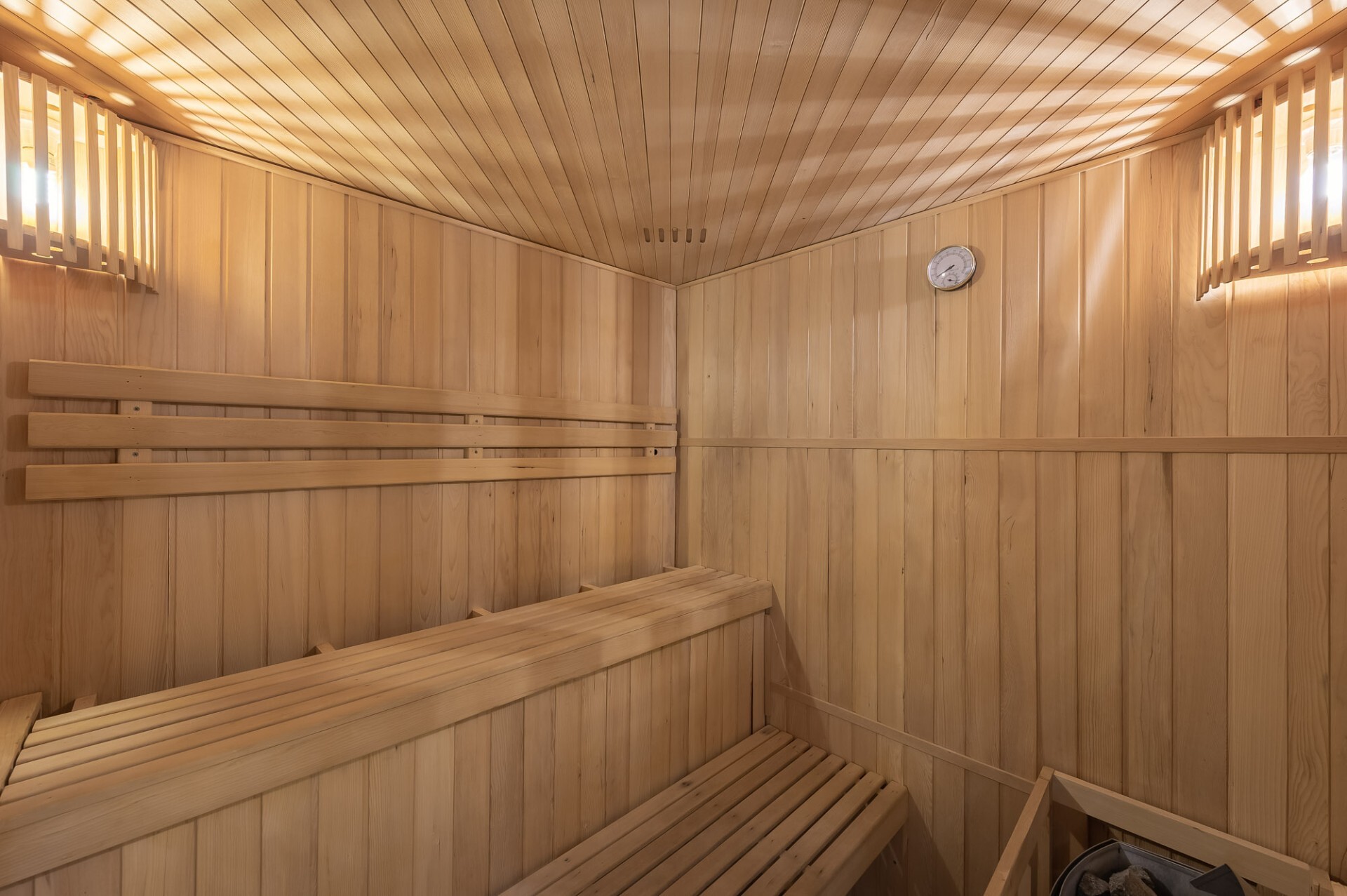 On level 0: a spacious entrance and a private sauna with shower to relax after a day of skiing. You’ll also find a storage area.