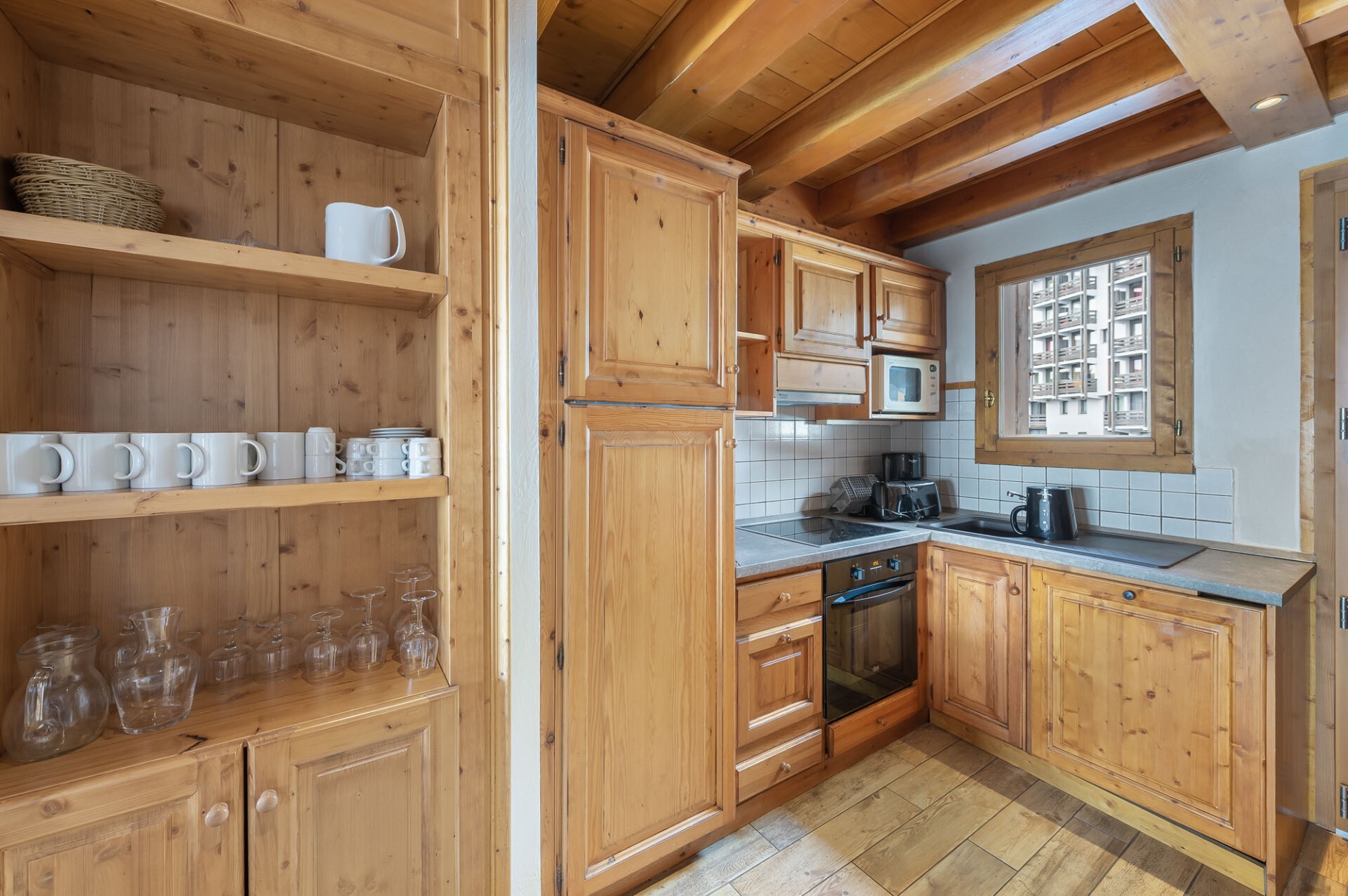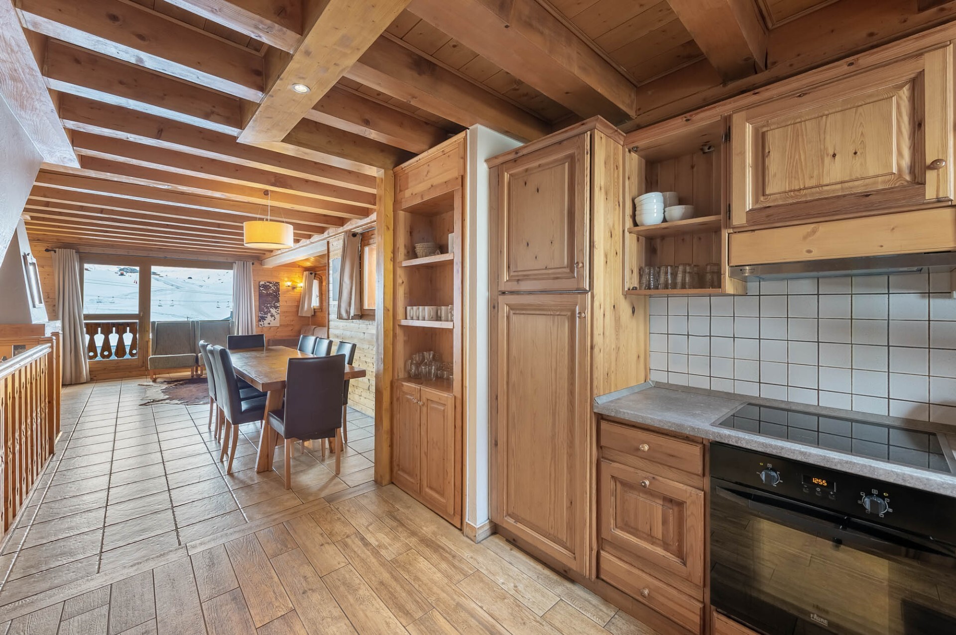 Level 2: a bright living room with a fully equipped open kitchen. The balcony accessible from this level offers a panoramic view of the surrounding mountains.