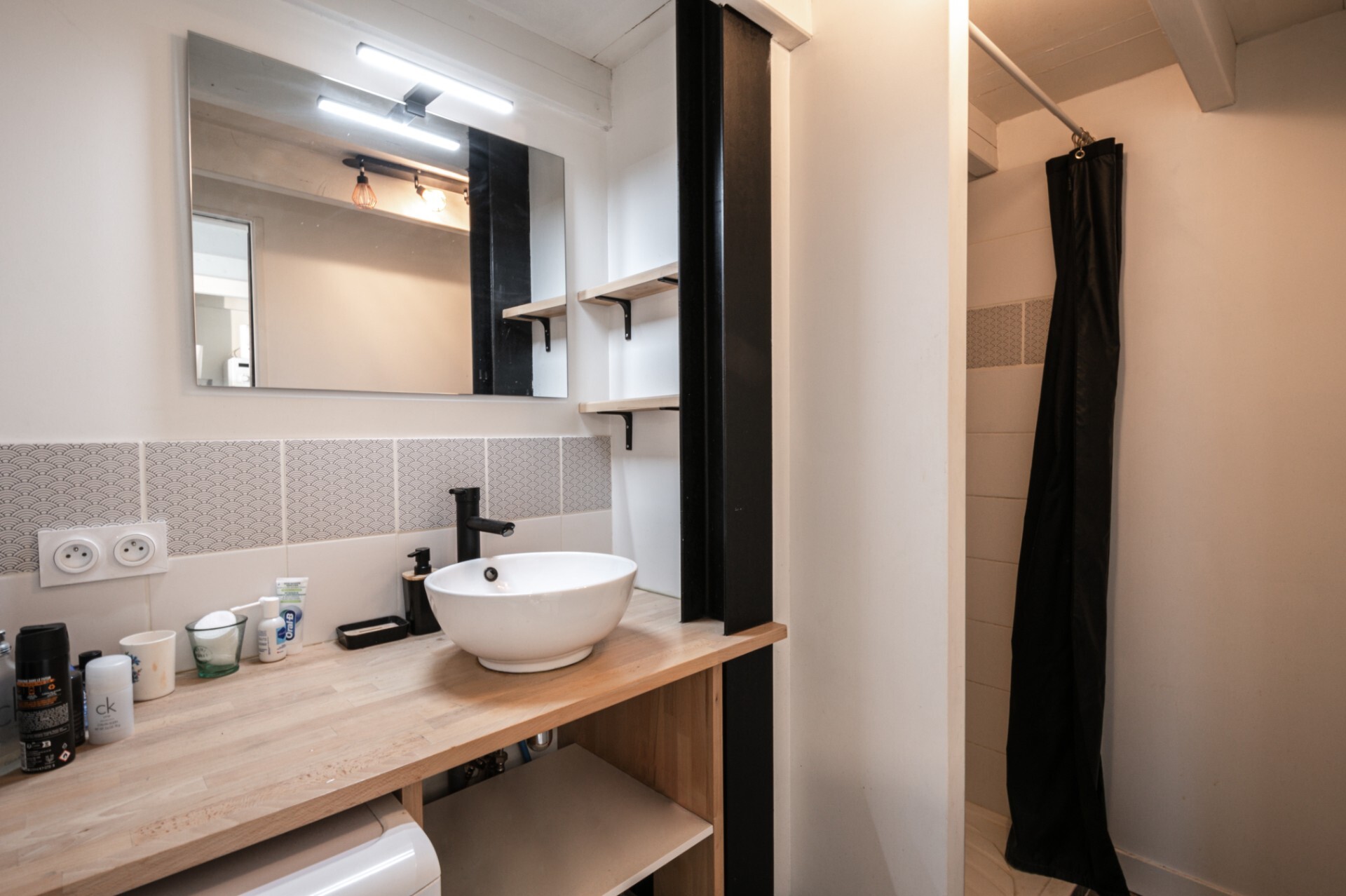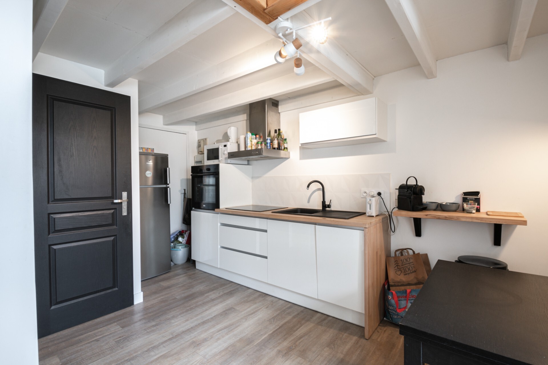 The flat has a floor area of around 42 sq. metres, including 29 sq. metres under the Carrez law. It comprises a large, bright entrance hall with storage space, a lounge opening onto an open-plan fitted kitchen, a shower room with WC and a wooden staircase leading to the mezzanine with its double bed and storage space.