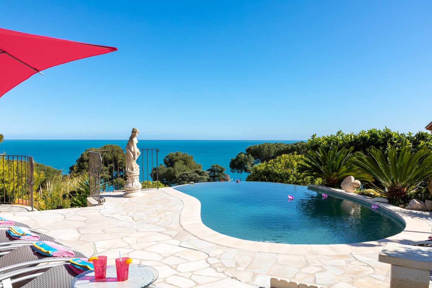 This very private magnificent single-story Mediterranean villa Carlo, was completely renovated in 2013. The furnished south-facing terraces overlook the Mediterranean garden with a panoramic view of the sea and the mountains. This beautifully furnished villa takes full advantage of its Provençal roots with tile floors throughout, exposed wood beam ceilings, and a large, open, warm and rustic living room.