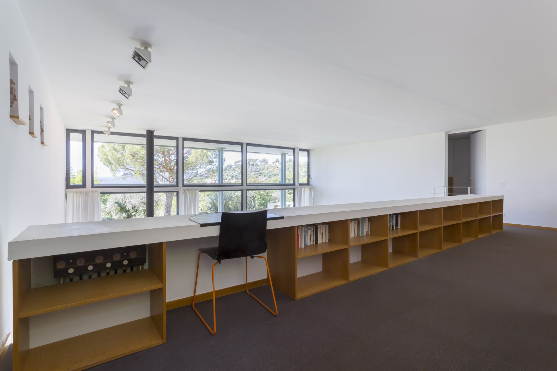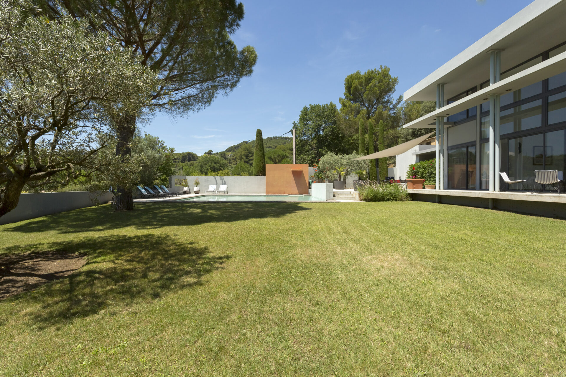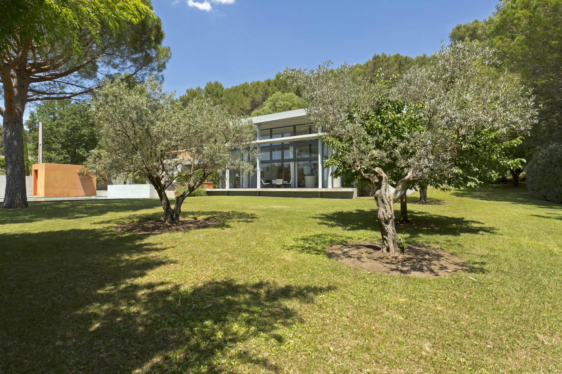 The house itself is quite unique in style for the area. Designed by a local architect, it was intended to be open, light and spacious, in striking contrast to the Provençal mas or villa. The very spacious living room looks out south through the glass façade onto the tailored garden, the village and the nearby medieval castle.